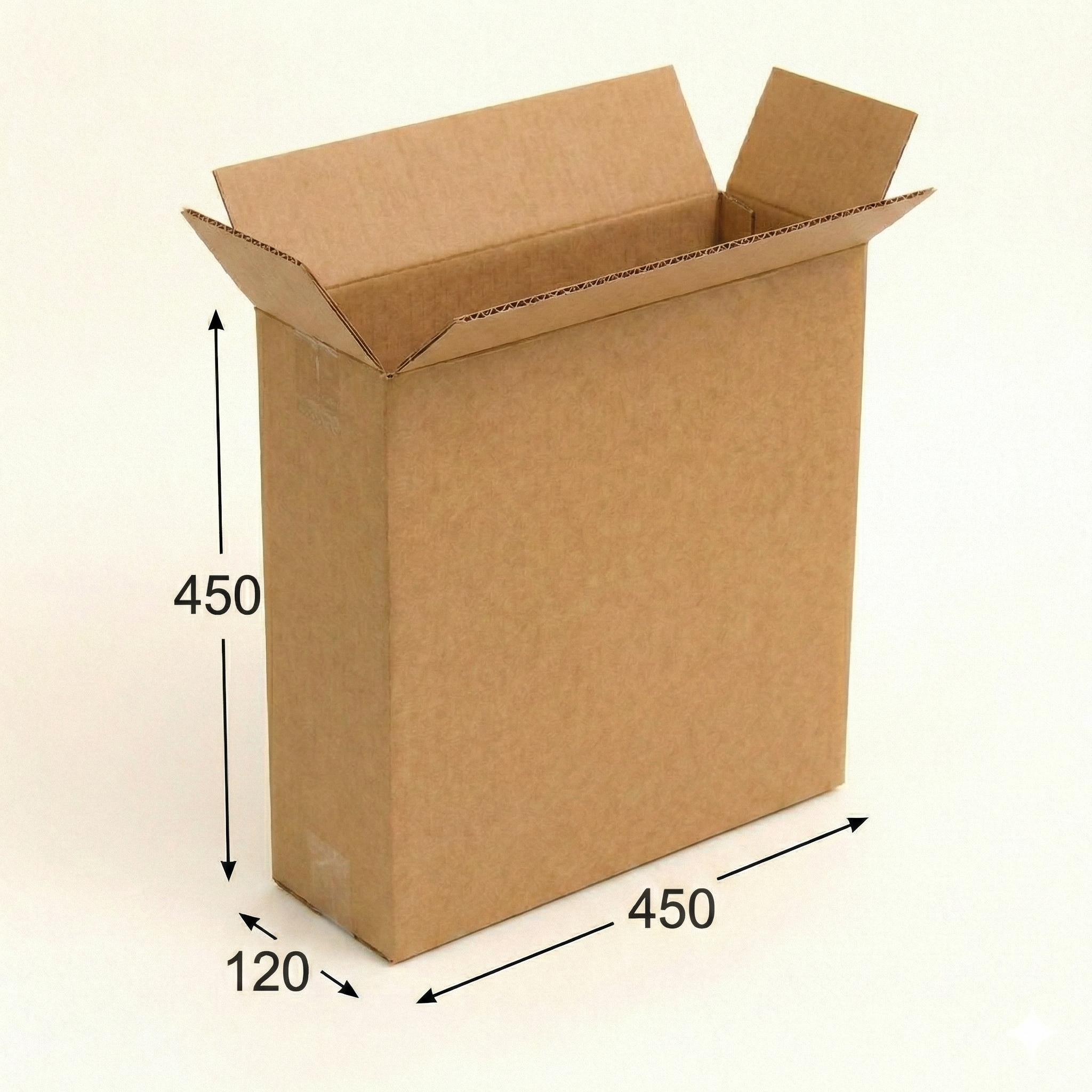 Коробка картонная 450х120х450 мм — универсальный гофрокороб для упаковки, хранения и транспортировки товаров различного назначения. Размер 450х120х450 мм (длина 450 мм, ширина 120 мм, высота 450 мм) делает этот короб 450×120×450 удобным для размещения плоской, габаритной или вертикально ориентированной продукции. Картонная коробка 450х120х450 мм изготовлена по стандарту FEFCO 0201 — классическая четырехклапанная коробка, коробка типа 0201 под скотч, подходящая для ручной упаковки, заклейки на автоматической линии и работы с заклейщиком.